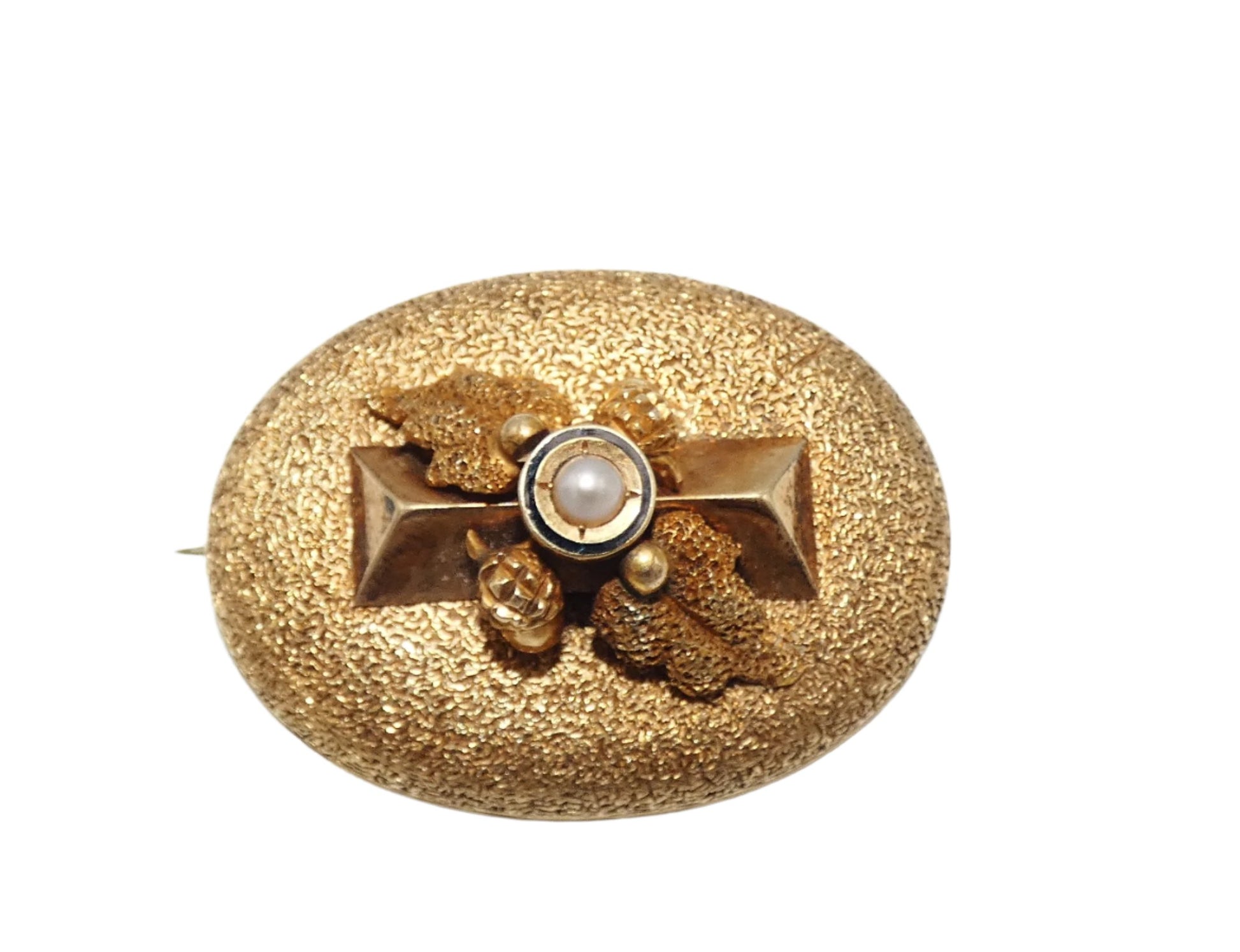Offering a 14k gold Victorian earring and brooch/watch pin set. The oval shape pin has a textured background with a oak leaves and accorns. A seed pearl sits in the center surronded by a black enamel ring. Brooch closes with a C-catch with a wath hook at the bottom. Center pearl measures 3mm.