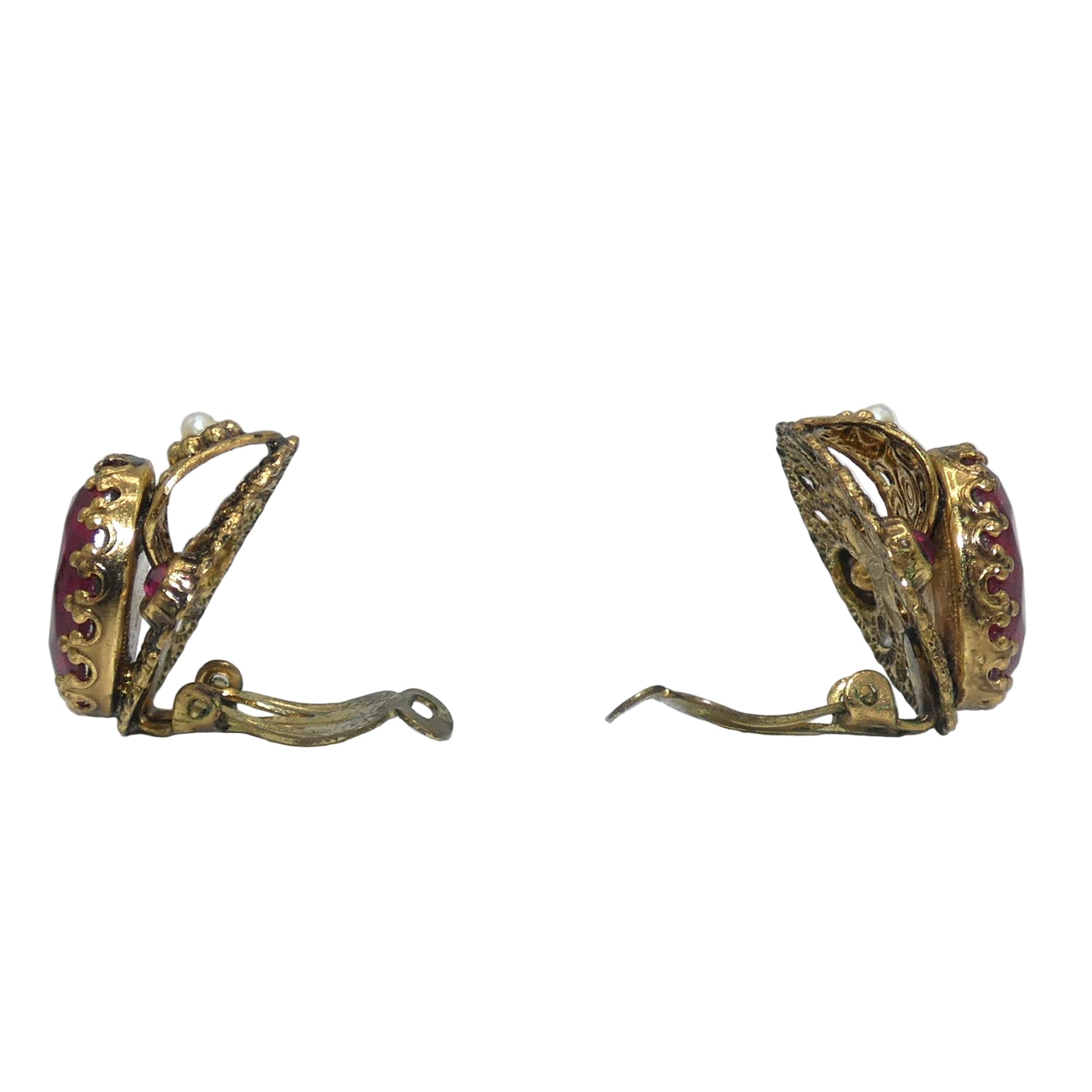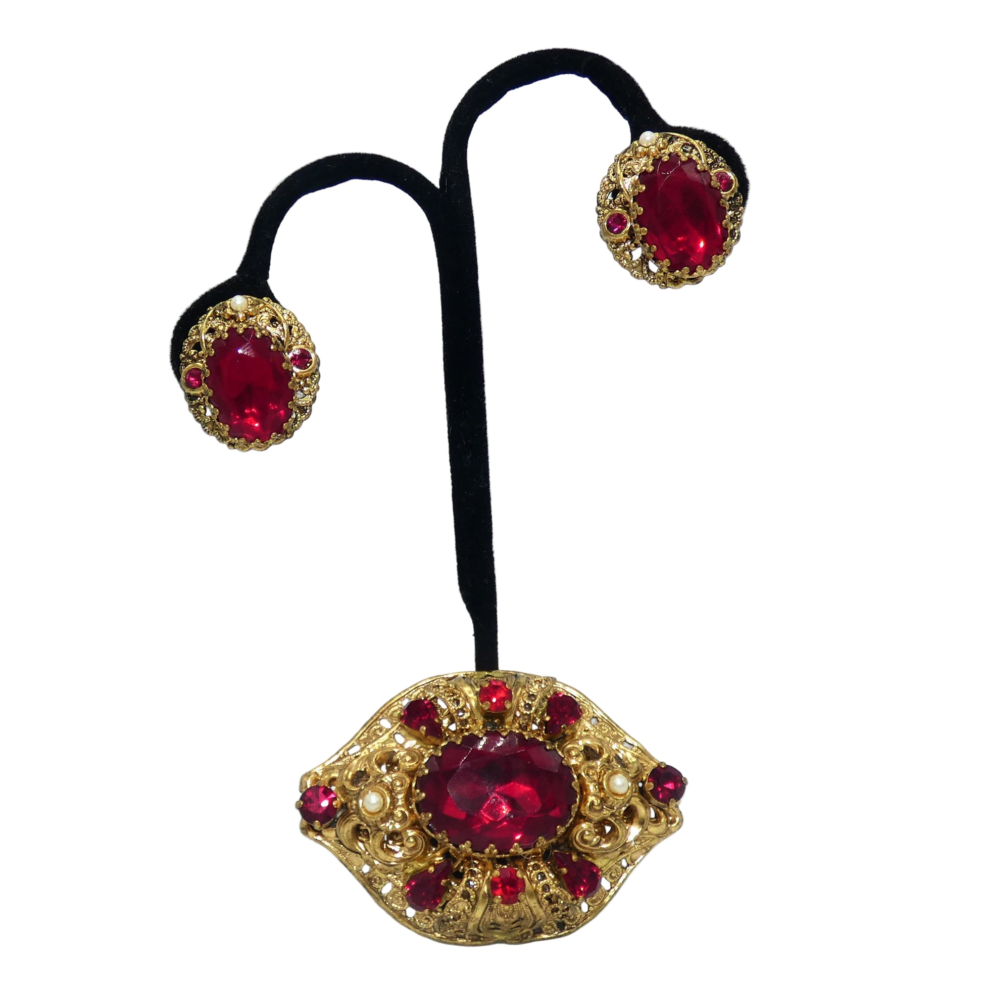 Offering a pretty W. Germany brooch & earrings, a gold tone fillagree set with red glass in round, oval & pear shapes and faux pearls. No mark on the brooch the clip earrings are marked W. Germany.