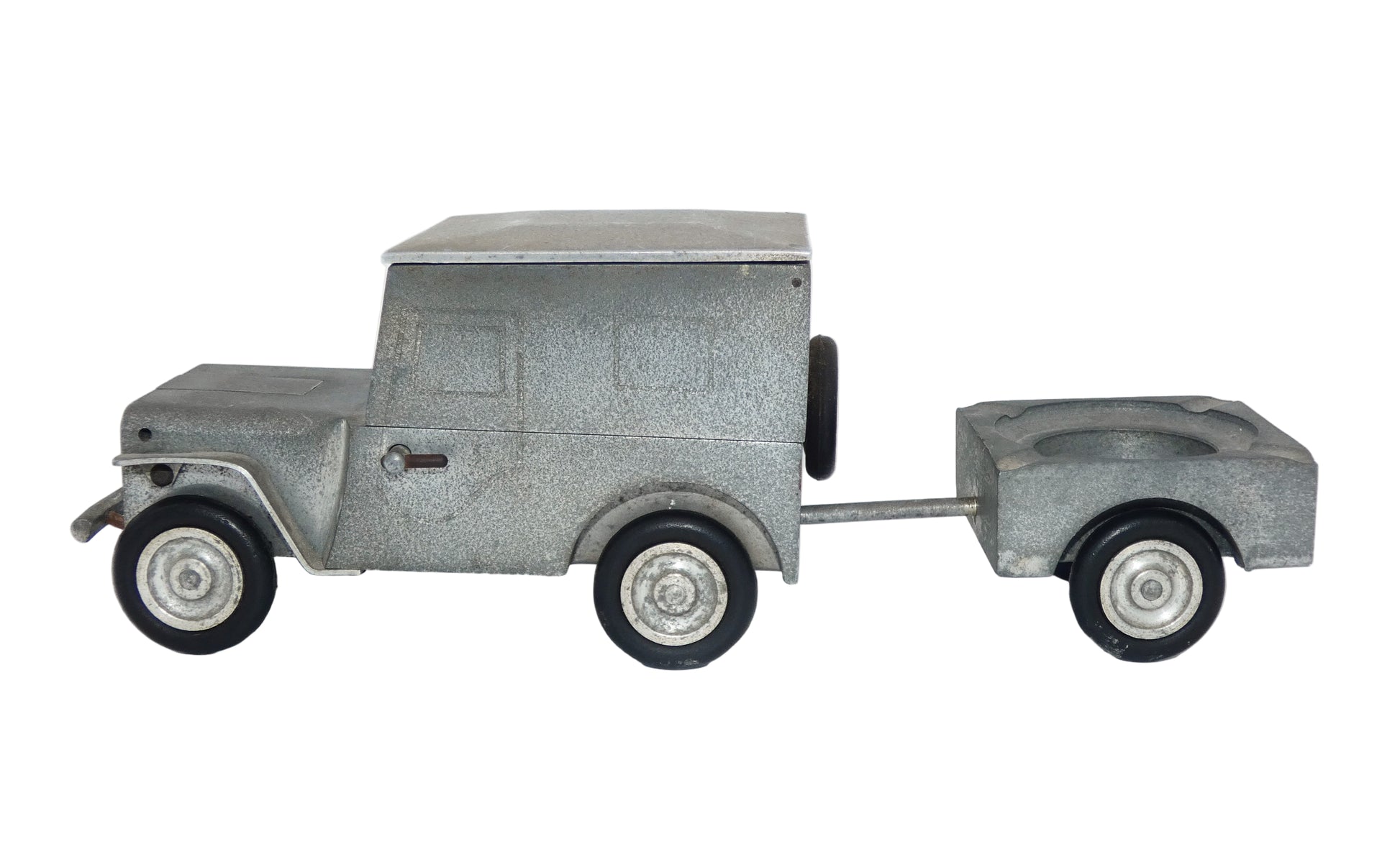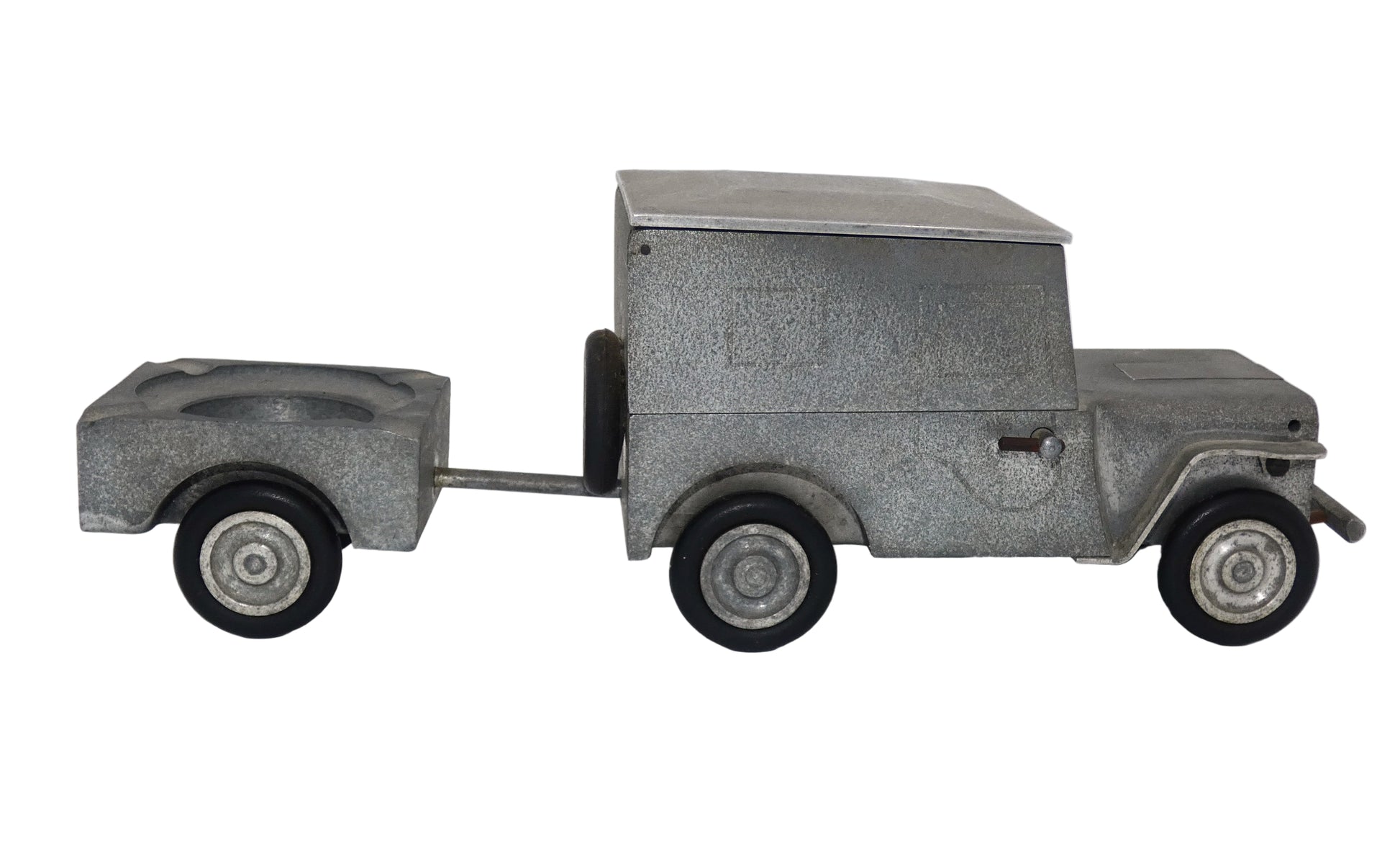 Offering an Aluminum Army Jeep Lighter Ashtray from the 1950s is. Made in West Germany. Bottom stamped GES-GESCH. The lighter is in pre-owned condition, having been used in the past with no modifications. The lighter function has not been tested but appears to have no noticeable damages or flaws. The brand is W. BAIER, and has a torch lighter, cigarette holder, and ashtray. Aluminum has some minor scuffs/scratching but otherwise looks to be in good vintage condition. Measures 10" long, 3" wide.