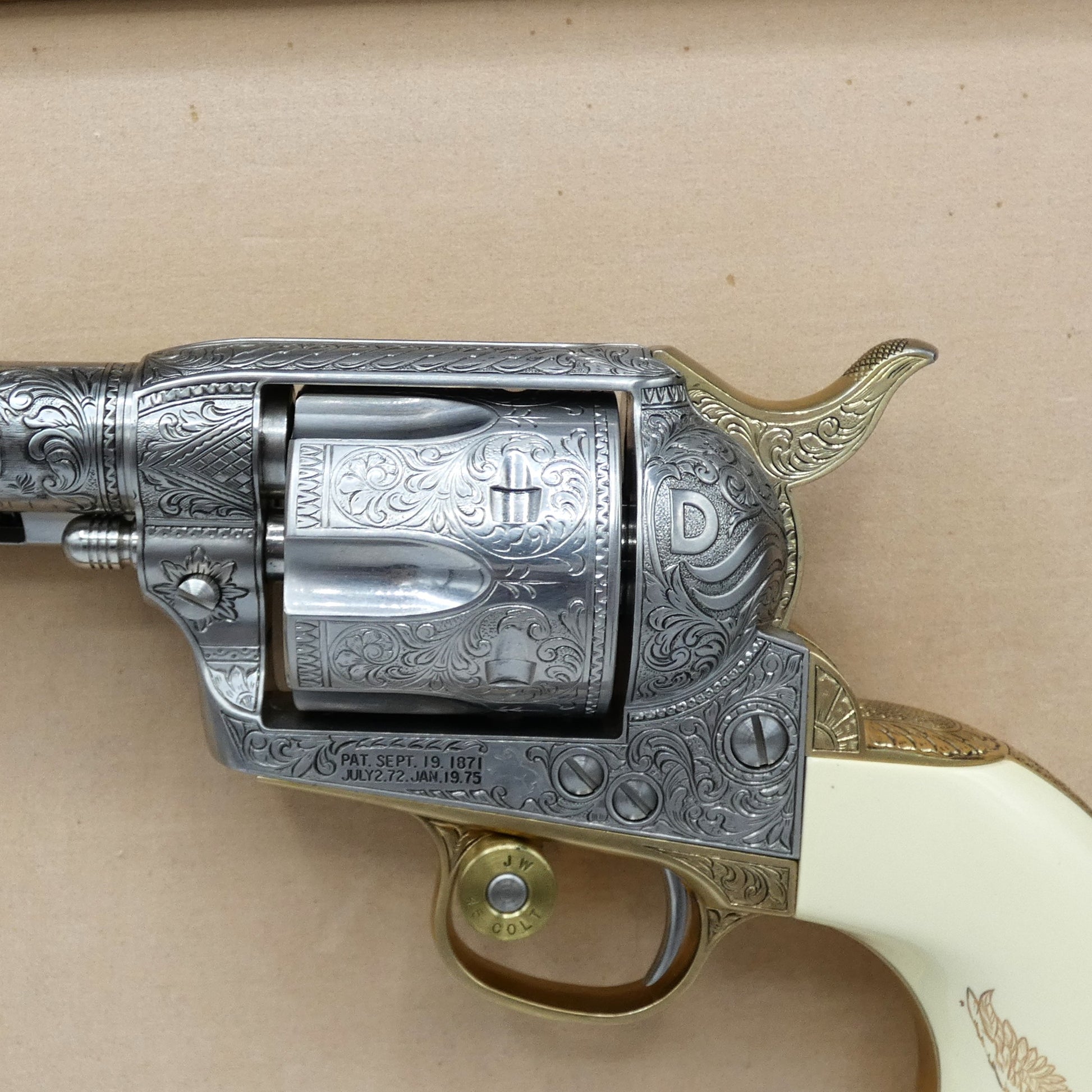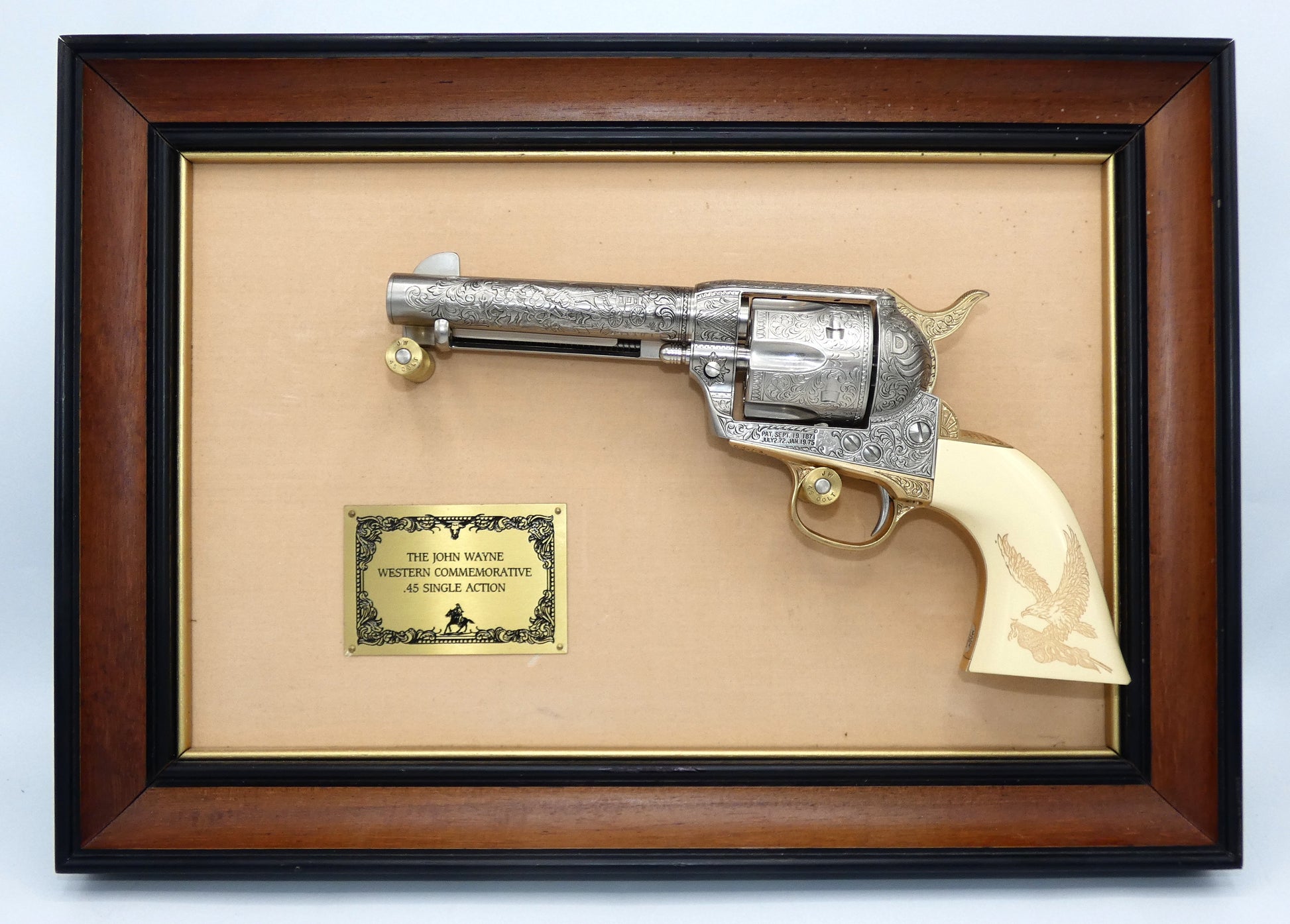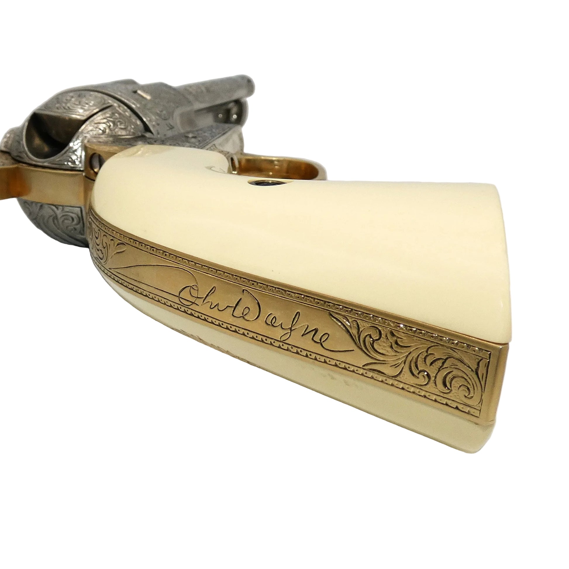 It bears John Wayne's signature and has been embellished with oak leaf scrollwork designs and 22 karat gold electroplate accents over burnished nickel.The grips have a slightly stained look. This is to replicate Duke's real grips that he soaked in tea to create the look.