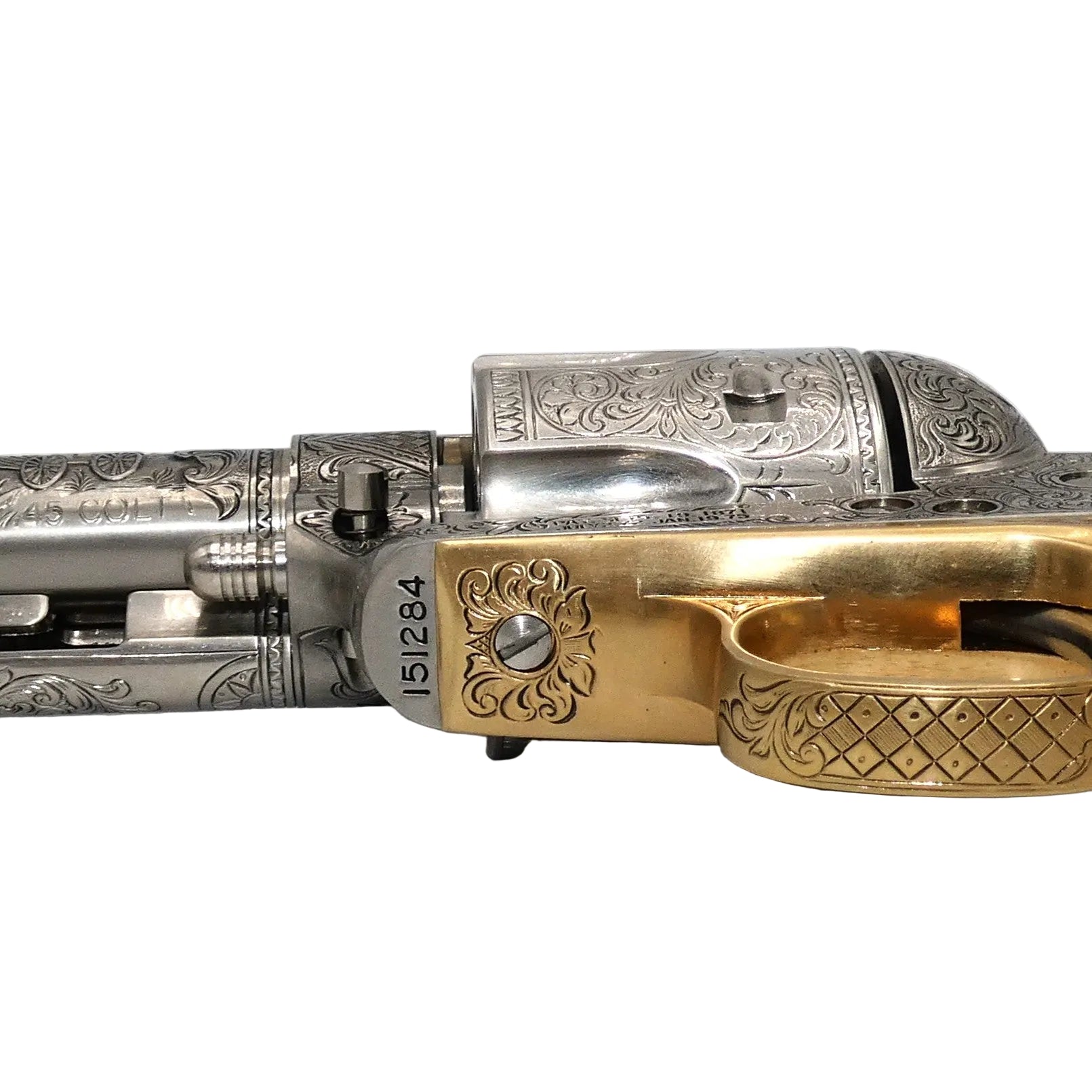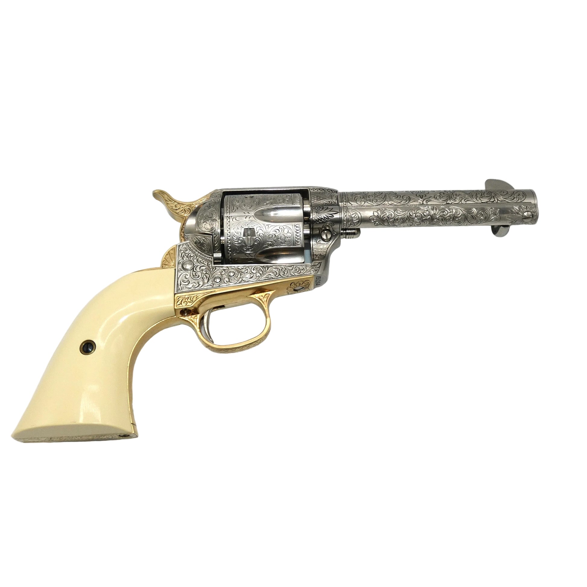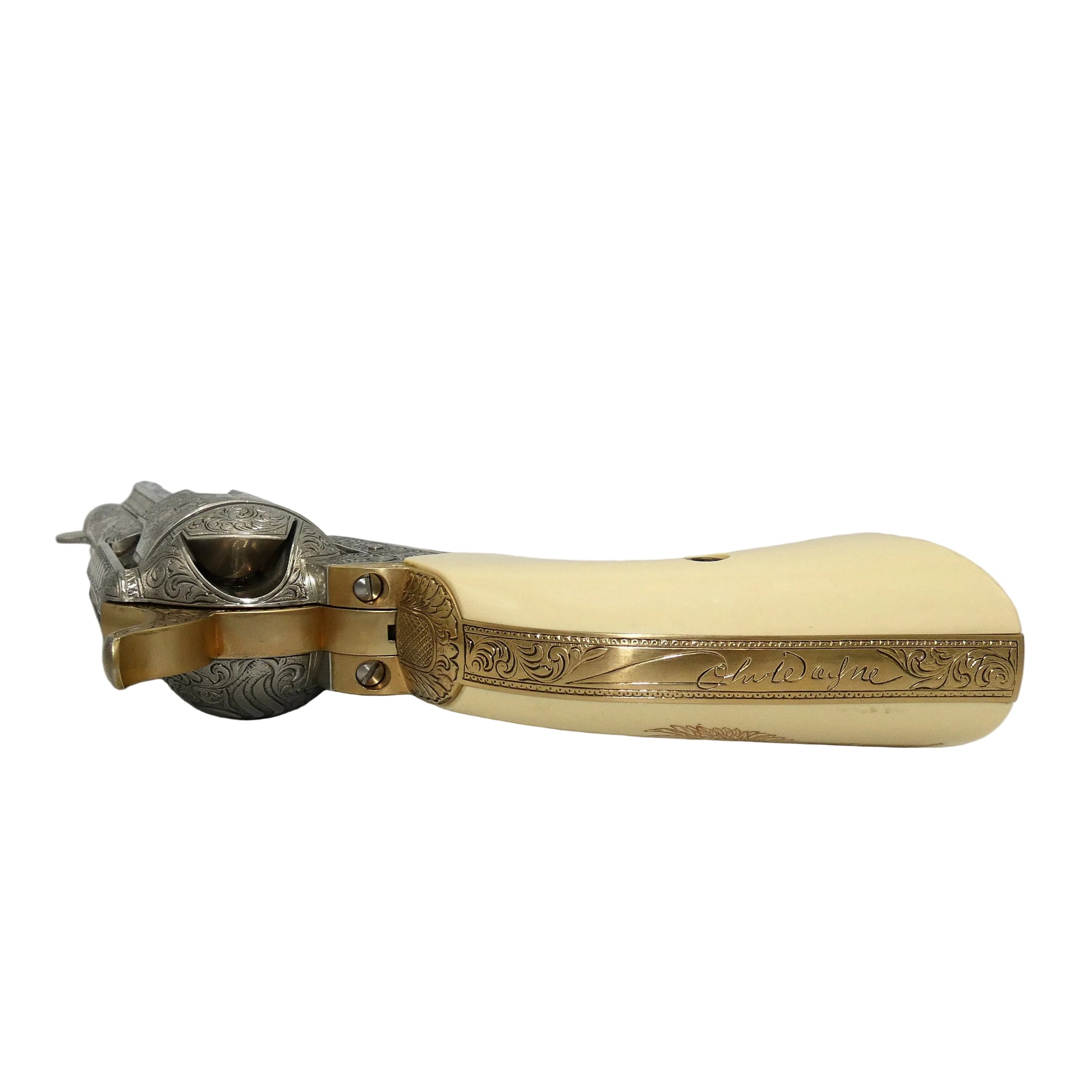 It bears John Wayne's signature and has been embellished with oak leaf scrollwork designs and 22 karat gold electroplate accents over burnished nickel.The grips have a slightly stained look. This is to replicate Duke's real grips that he soaked in tea to create the look.