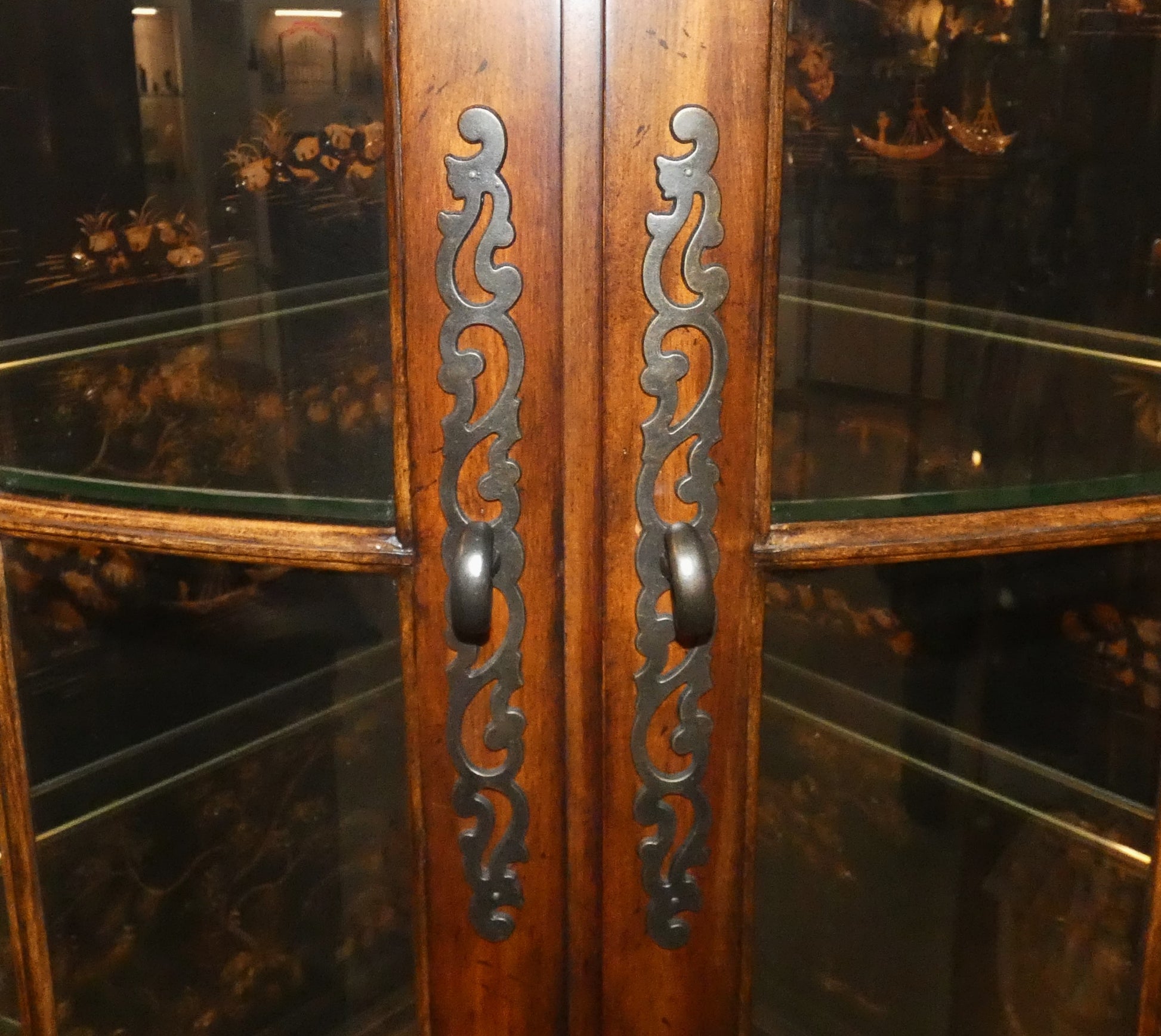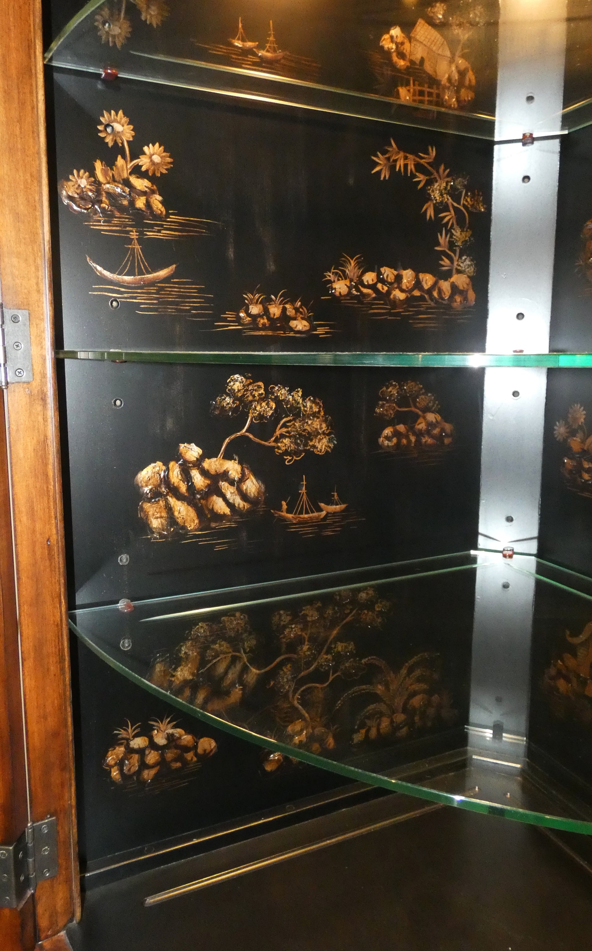 A pretty Thomasville lighted corner cupboard glass top with an asian inspired scene inside. There are 3 glass shelves and a base shelf all have plate display groves and you touch the a hinge for the light to come on. The base has wood doors and a centered shelf.