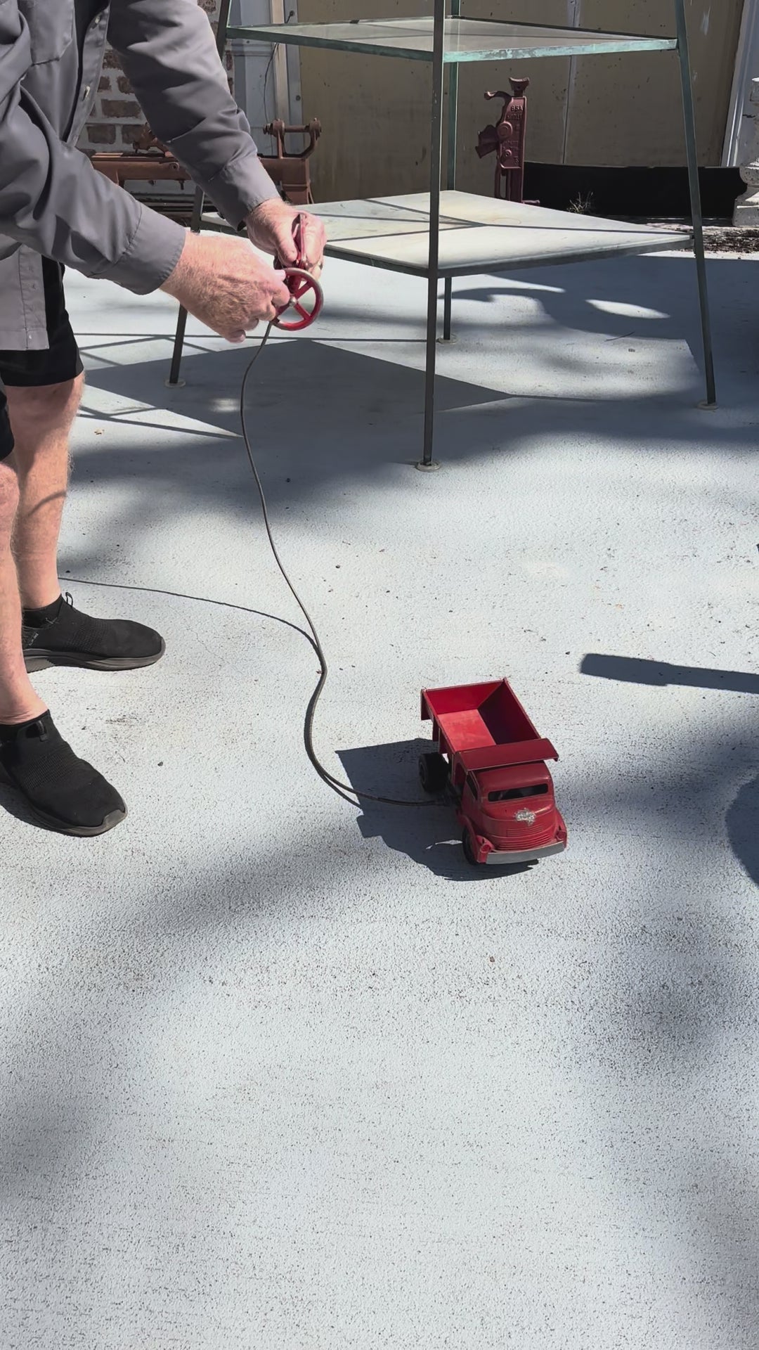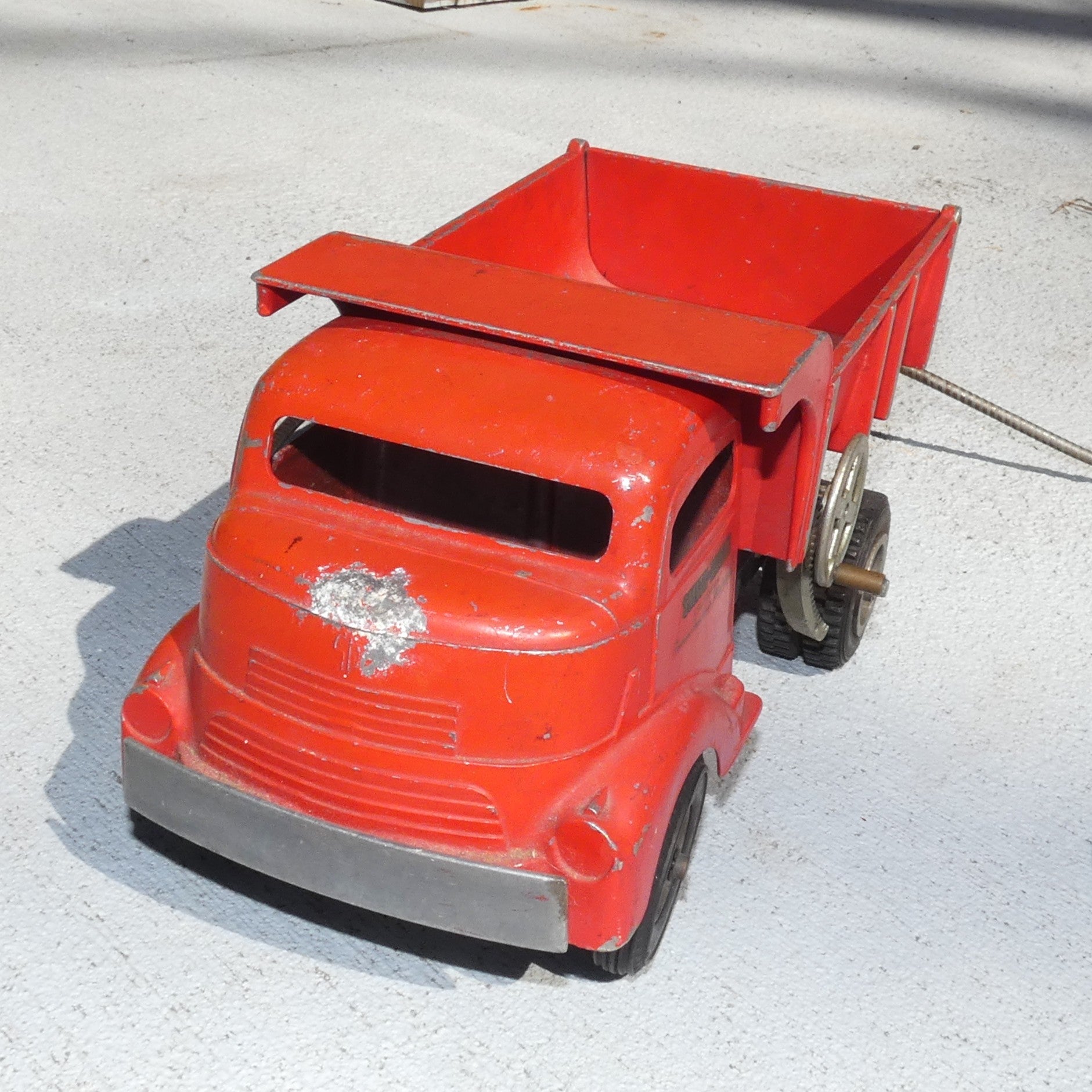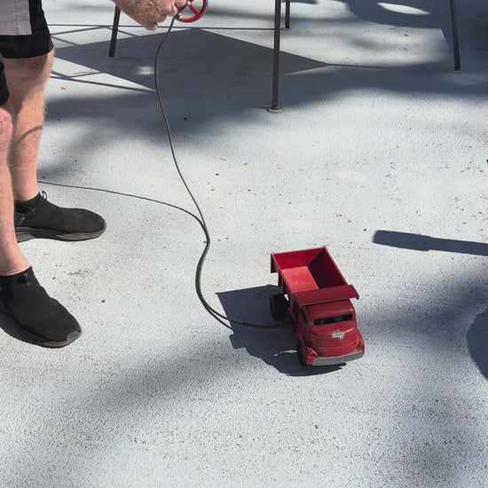 An original Smith Miller "Smitty" toy "Drive-O" dump truck. This features a working hand-held remote control and control cable. The control has both forward/reverse movement and steering control. A crank that turns the sleeved cable spins a cog and chain to drive the rear wheels.